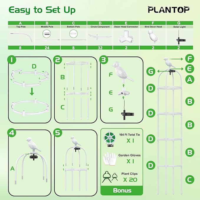 - 🌞「Solar Light Obelisk Trellis」- Enhance your garden trellis with an integrated solar light panel that illuminates the decorative head at night, casting a beautiful glow and adding a magical touch to your outdoor space. This trellis not only draws attention to your plants, adding charm and character to your garden, but also provides essential support for your plants to climb and thrive, promoting healthy growth and creating a lush, green display.
