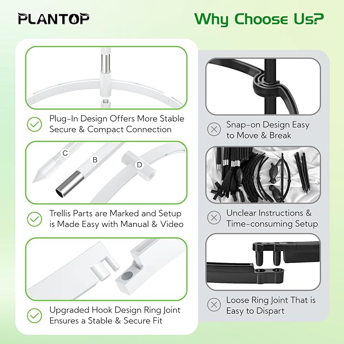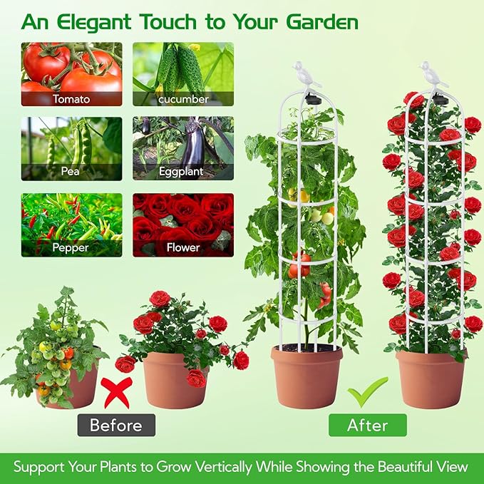 - 🥒「Wide Application」- This plantop trellis for climbing plants is designed to cater to a wide range of plants, including roses, clematis, ivy, jasmine, and more. It aids in the growth of various vegetables like tomatoes, cucumbers, and eggplants, as well as fruits like blackberries and grapes. The ergonomic design prevents the stems from bending under the weight of fruits and leaves, promoting healthier plant growth.