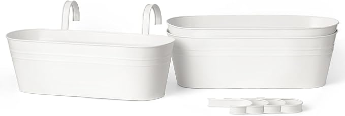 Dahey 3 Pcs Metal Iron Hanging Flower Pots for Railing Fence 15.7 Inch Hanging Bucket Pots Countryside Style Window Flower Plant Holder with Detachable Hooks for Garden Yard Home Decor, White