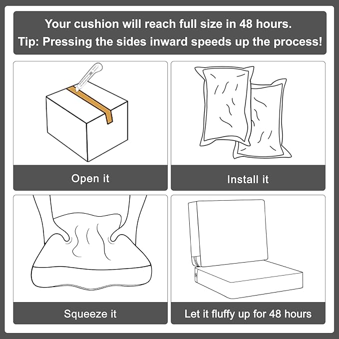 - Size Selection - Set includes a seat bottom measuring 19” W x 19” D x 3” T and a cushion back measuring 19” W x 16” H x 3” T. ( The size description is only for the cushion size, accurately measuring the dimensions of your furniture's seating area in advance, make sure the cushion size fits your furniture ). Slight size variations (±0.5") may occur due to handcrafted cutting. Please allow 48 hours for cushion to fully expand after opening.