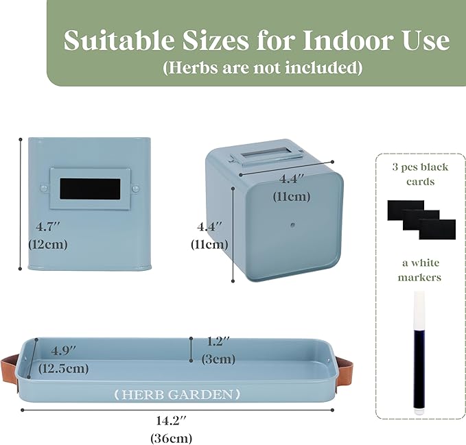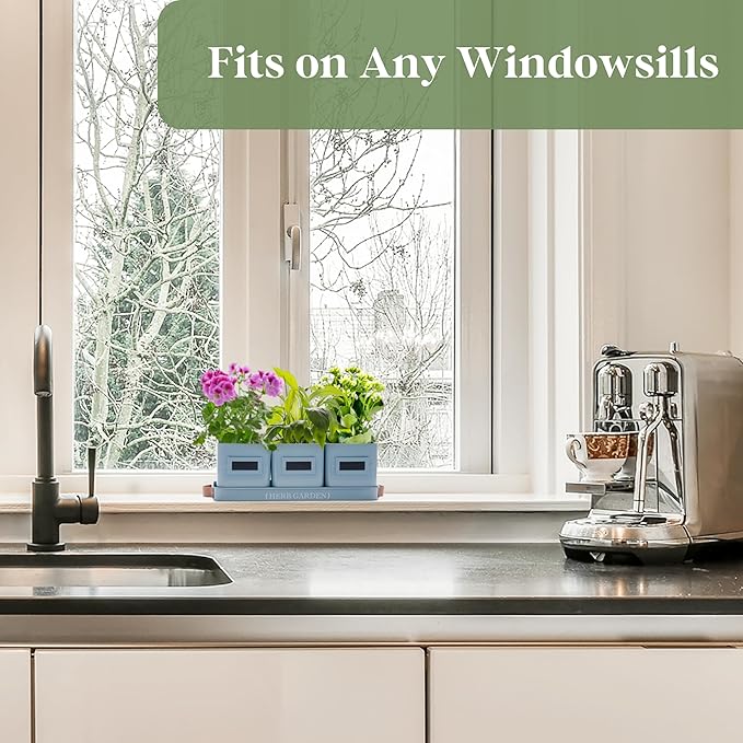 - 【Windowsill Herb Garden】Our window herb garden includes three pots and a tray with a handle, with each pot measuring 4.4" W x 4.7" H, and the tray measuring 14.2" L x 4.9" W x 1.2" H. It's ideal for growing a variety of herbs such as mint, rosemary, basil, thyme, etc. Tailored for herb growth, our indoor herb pots provide an optimal environment for nurturing your herbs. Their farmhouse design and compact size make them perfect for placement on a windowsill or kitchen countertop.