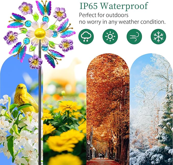 - 【Materials and Sizes】The wind spinner is made of 5 flowers and 5 delicate butterflys, and coated with rust proof coating to improve durability. Size: 40.9" H * 6.7" W * 11.2" L.