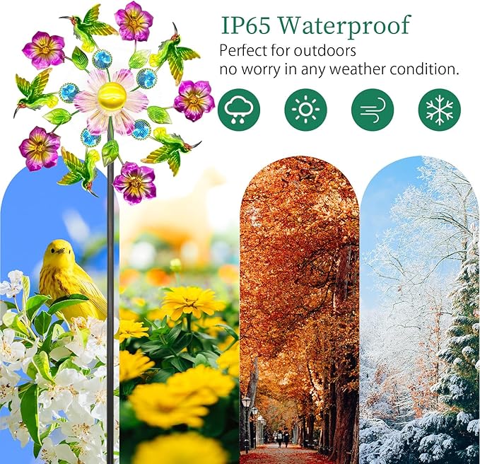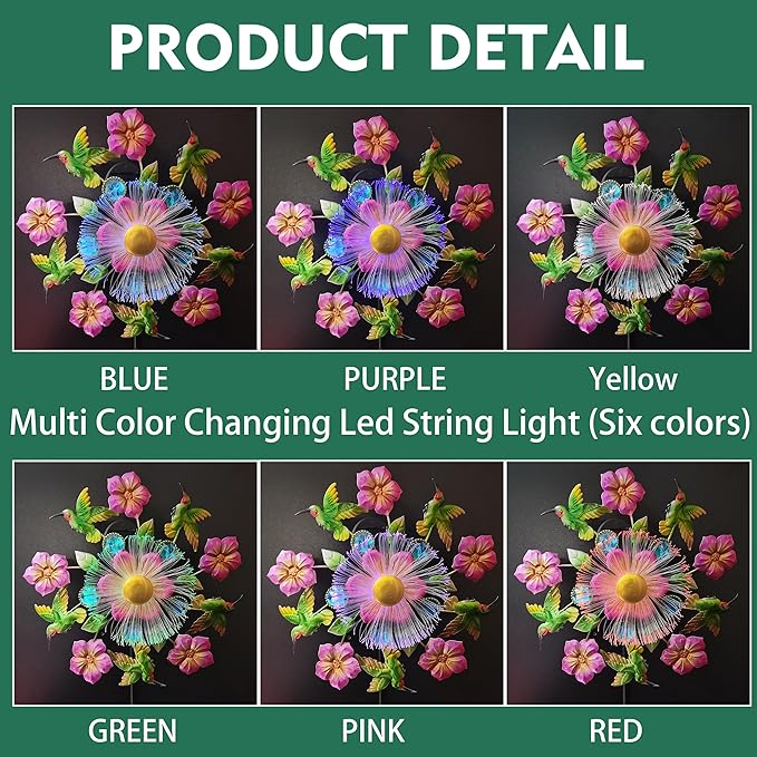 - 【Easy installation】The wind spinners are very easy to install, just tighten all the components and insert them into the ground or lawn to decorate your yard, garden, etc. The colored LED lights will automatically turn on and can last for 8 hours or longer at night.