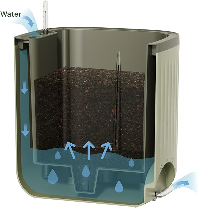 - Water Level Gauge & Drain Plug Design: The water gauge makes it easy for users to keep track of the water level. Adjust the lever to change the water storage volume based on the needs of your plant. There is a plug on the water level regulator (to prevent mosquitoes from entering the water tank). When used indoors, the water plug needs to be plugged to prevent water leakage. When using it outdoors, it is recommended to remove the water plug to prevent rainwater from soaking the soil in the basin when it rains.