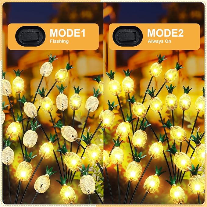 - Pineapple Solar Energy Powered: the solar outdoor light is powered by solar energy and provides 2 adjustable modes, always on and flashing; After being fully charged, it can light up all night, automatically turn off during the day, and automatically provide lighting at night; Please adjust the solar panel to face the sun during the day to start charging; At night, it can automatically emit pineapple yellow light and sway with the wind