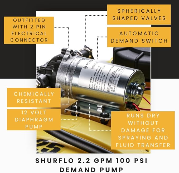 - PUMP PROVIDES POWER: 12V SHFLO pump outputs 2.2 GPM and 100 PSI. Reliable pressure ensures even spraying for herbicides, insecticides, and fertilizers across small farms or lawns
