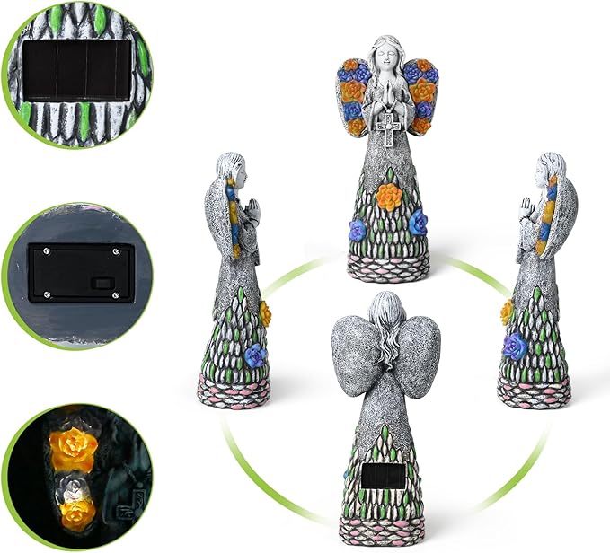- đź’ŽSolar Angel Statue Outdoor: The angel statues with eyes closed, holding a cross, wing emitting sparkling light and possessing divine power. she seemed to be praying.The Lord is my helper;I will not be afraid.
