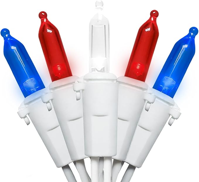 - 【Patriotic Mini String Lights Specification】: 1 Sets - white wire independence day string lights includes 100 count red white blue led lights, total length 35.3ft, lights length 33ft and each led is 4 inches apart, 24 inches lead wire, 4 inches end connector (Extra 2 x bulbs and 2 x fuse included)