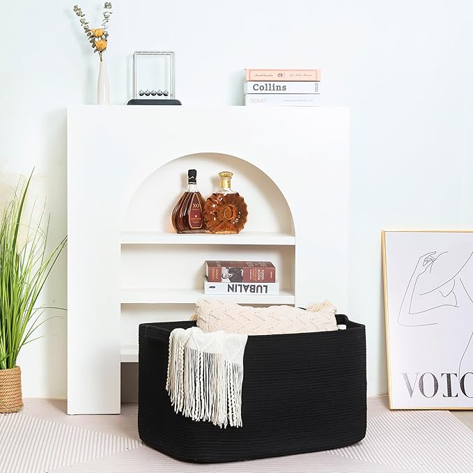 MINTWOOD Design 22in Extra Large Blanket Basket Holder Living Room, Rectangle Rope Woven Storage Basket with Handles for Laundry, Pool Towels, and Shoes, Dog Toy Organizer Bin Box, Full Black