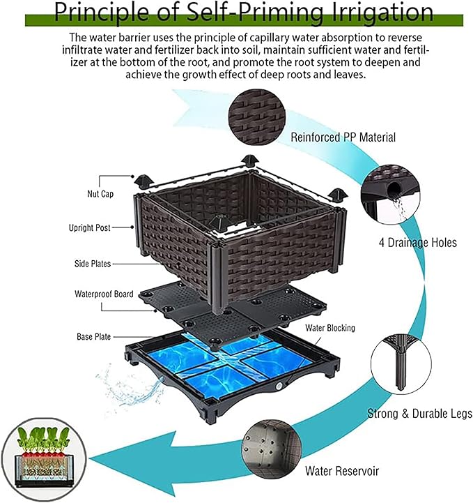 - 🌻【Durable Outdoor Growth Box】Our elevated planter boxes are made of reinforced PP material with a rattan pattern that is durable, lightweight, high load bearing, washable and reusable.
