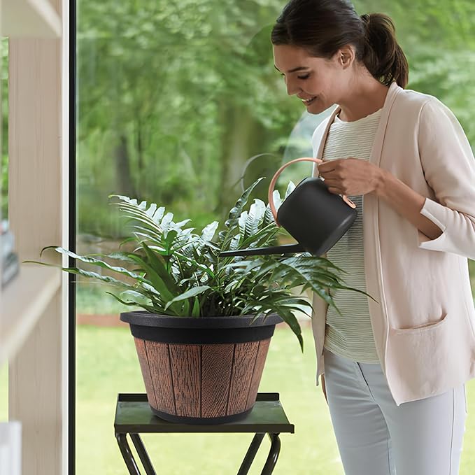 - 🌱【Vintage Design】4 Pack 14 inch large outdoor planters adopt vintage style to match your home decor, the rugged look and faux wine barrel design complements many different decorative styles. You can feel this peaceful rustic comfort when planting in your garden or front yard.