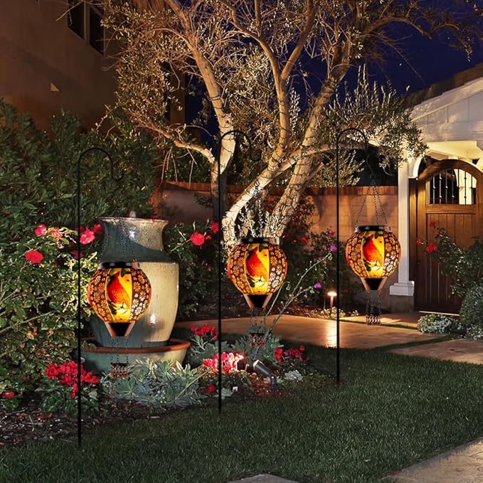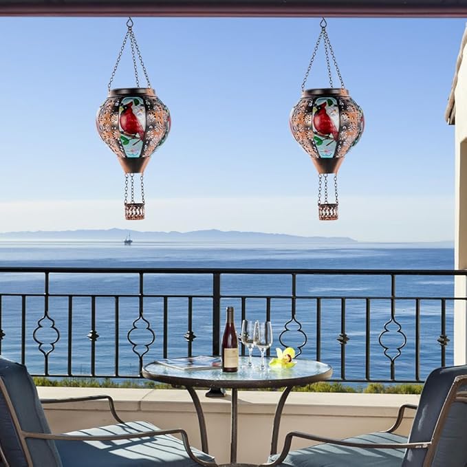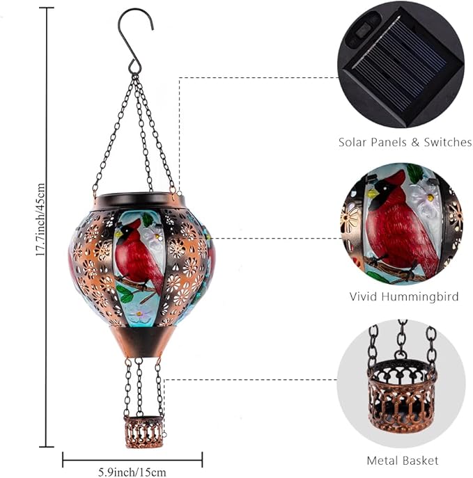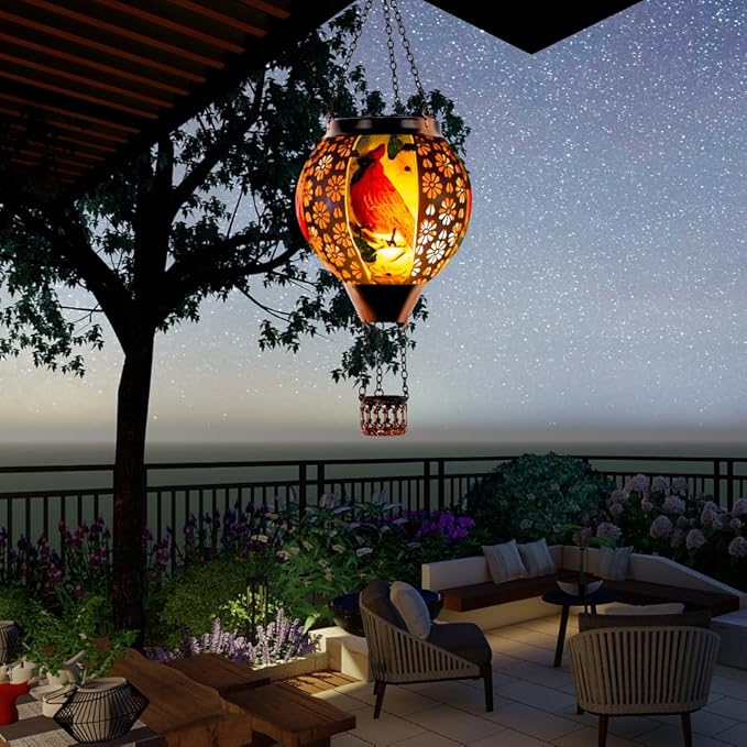 - Hot Air Balloon Solar Lantern: DREAMSOUL solar lanterns outdoor waterproof are made of metal and glass, with flower hollow patterns on the metal and cardinal patterns on the glass. The appearance of a hot air balloon and the flickering flame lighting design make the outdoor lantern look like a real hot air balloon, creating a warm and beautiful atmosphere for your garden
