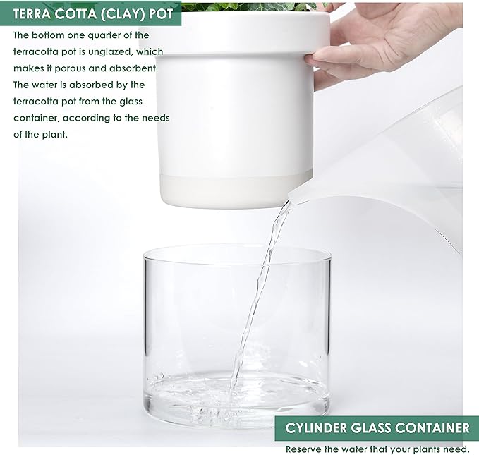 - [Self-watering System] The bottom quarter of the terracotta pot is unglazed, just fill the glass container with water to ensure plants will absorb only what they need through the terracotta pot walls.