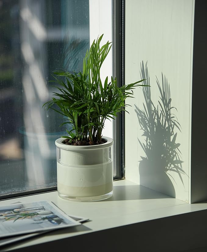- Self-watering System: The bottom section of the white terracotta pot is unglazed, just fill the glass container with water to ensure plants will absorb only what they need through the terracotta pot walls.