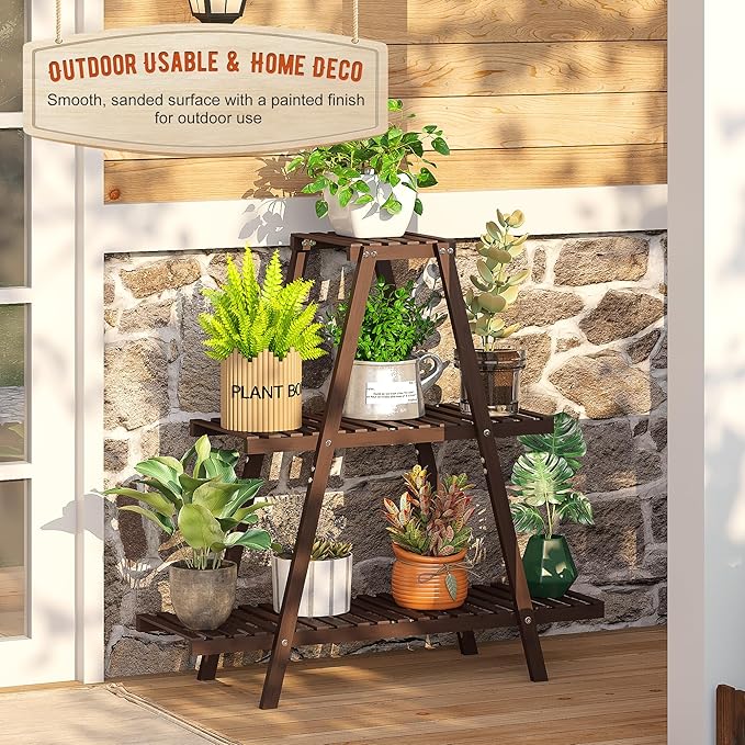Plant Stand Indoor Plant Shelf Outdoor bamboo Plant Rack, 3 Tiers Ladder Plant Holder Flower Stand for Living Room Balcony Garden Patio,Living Room Boho Home Decor for Gardening Gifts (Brown)