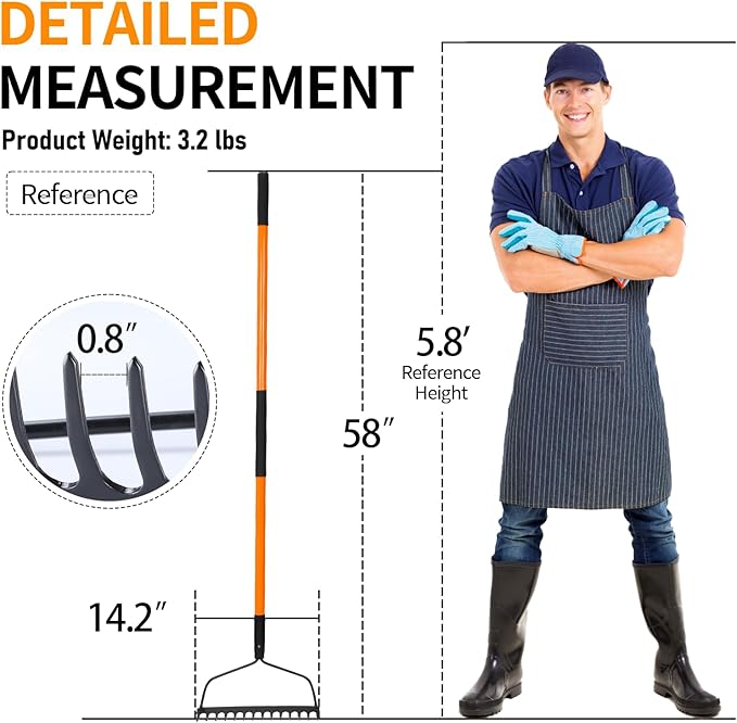 • Dimension: The 58 inches total length of the heavy duty metal rake is more suitable for adult use, and the right size reduces the pressure on the waist during use, and also improves the efficiency of long-term use.