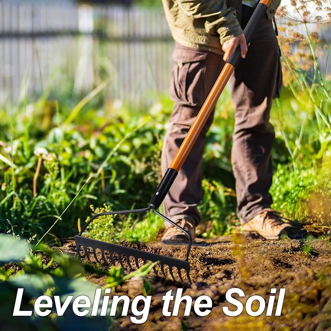 • 14 Tines Bow Rake: The bow rake with 14 sharp steel teeth can easily cut through the soil, and the wide bow rake head design can greatly improve gardening efficiency.