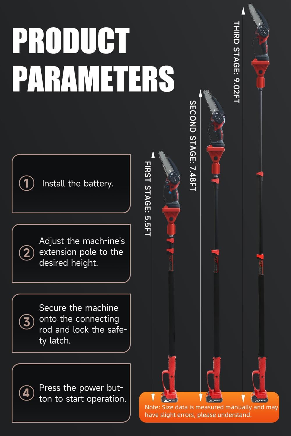 - 【3-in-1 High-Performance Electric Pruner Kit】This high-performance electric pruner combines the functionalities of an electric chainsaw and an electric pruner, accompanied by a telescopic extension pole spanning 8'. The pole's length is adjustable from 6'3" to 8' seamlessly, allowing effortless trimming of high-reaching branches. With this single tool, a wide array of tasks can be accomplished. Note: The product (pruner) does not display battery levels.