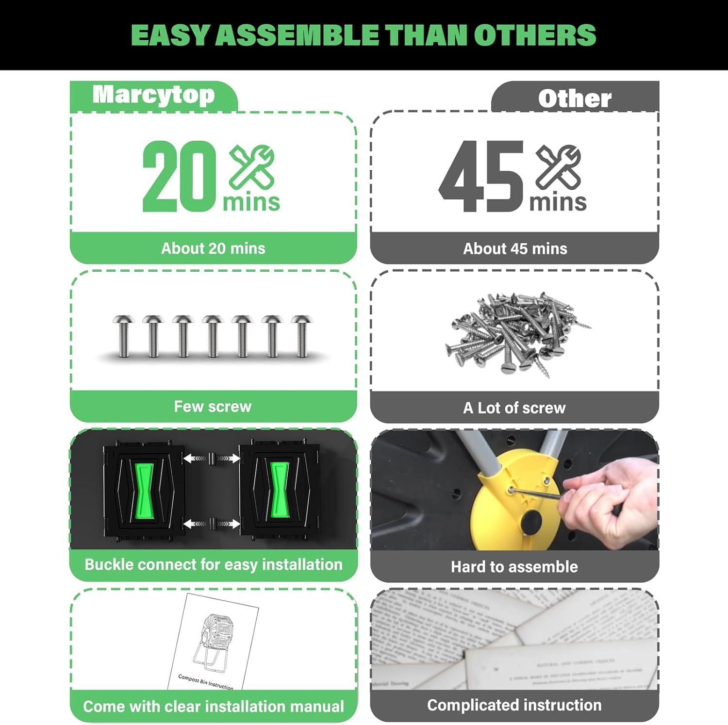 - Easy Assembly: Comes with all the necessary accessories and clear instructions to help you quickly and easily complete the assembly process. The Compost Tumbler is connected using buckles and fewer screws, ensuring a convenient and efficient installation. (About 30 minutes)