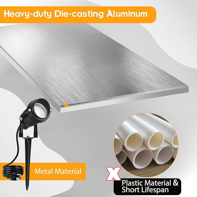 - Sturdy & non-deformable light construction. Whole light is made of aluminium, including stakes; dear customer, you can count on the quality of this lights'. IP65 waterproof for most weather conditions.