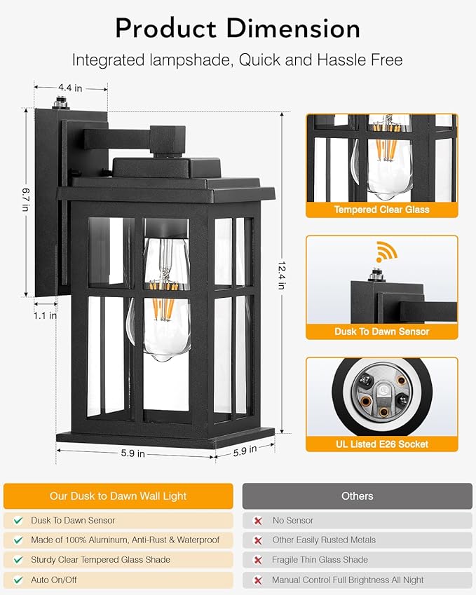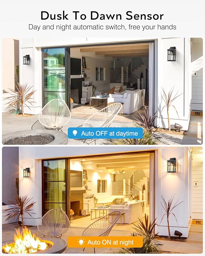 - đăAdvanced Dusk to Dawn SensorăExperience the smart functionality of our porch lights outdoor wall lights, thanks to its advanced dusk to dawn sensor. Equipped with a high sensitivity photocell sensor, these dusk to dawn led outdoor light intelligently turn on at dusk and turn off at dawn, based on the surrounding brightness. Free yourself from the hassle of manual operation and enjoy energy savings, bringing you unparalleled convenience in your day-to-day life.