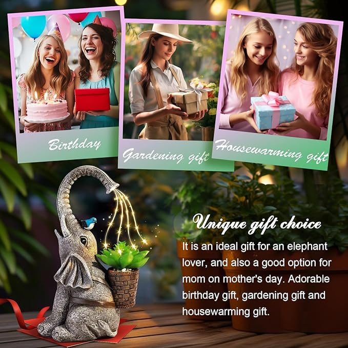 - Elephant Decor for Garden : The elephant carries succulents and comes with a solar-powered light strings, making it a unique outdoor decor for your garden, yard, backyard, balcony or lawn. Add a touch of elegance to your garden with this charming elephant statue