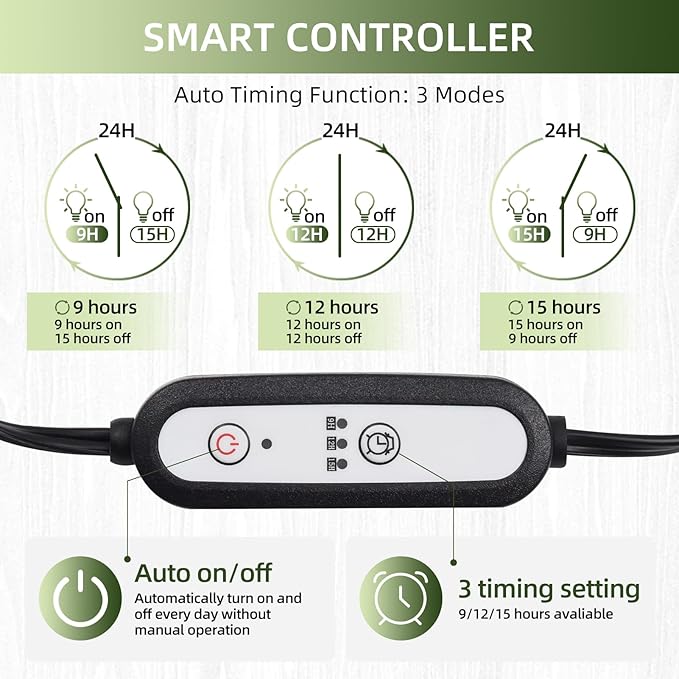 - 【Auto Turn On/Off Timer Everyday】: This plant growth light offers three cycle timing settings. It can remain on for 9, 12, or 15 hours, and then turn off for 15, 12, or 9 hours, respectively. Furthermore, it will automatically turn on and off at the same time every day.. This light provides a convenient way to ensure your plants receive proper care, even when you are away at work or on vacation.