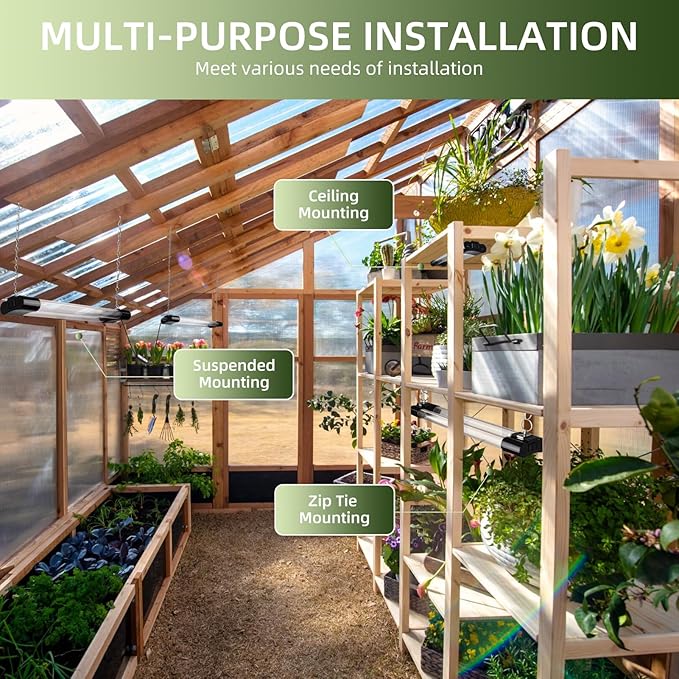 - 【Easy Installation & Safe】: These grow lights can be installed in a variety of ways to meet the needs of various installation environments. Equipped with screws, hooks,chains, zip ties and brackets.