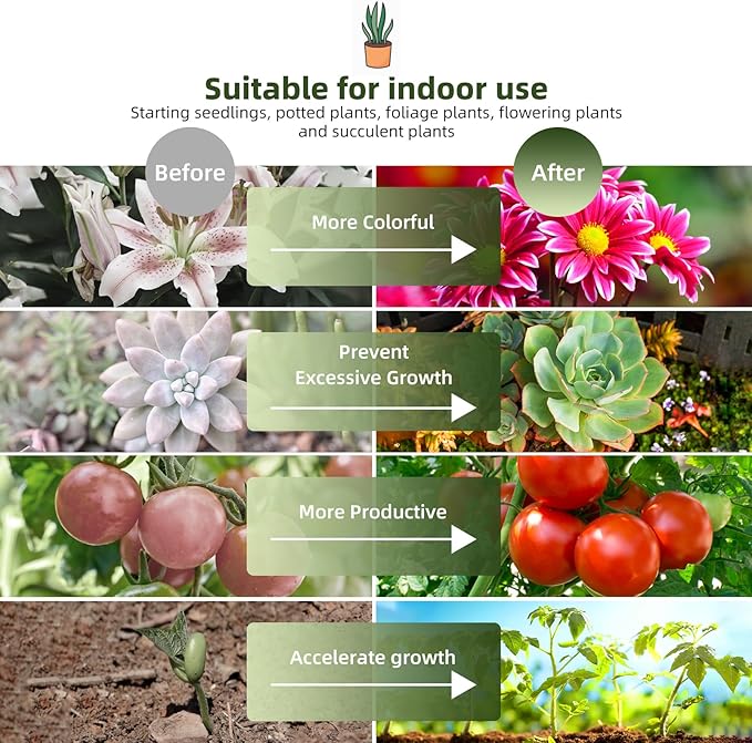 - 【Widely Application】: Suitable for use in shelves-plants, greenhouse, potted, catcus, kitchen, bathroom, grow box, darkroom. Especially in places with insufficient sunshine in winter.The grow light fixture with high PPFD can be used for seed starting, flowering and fruiting.