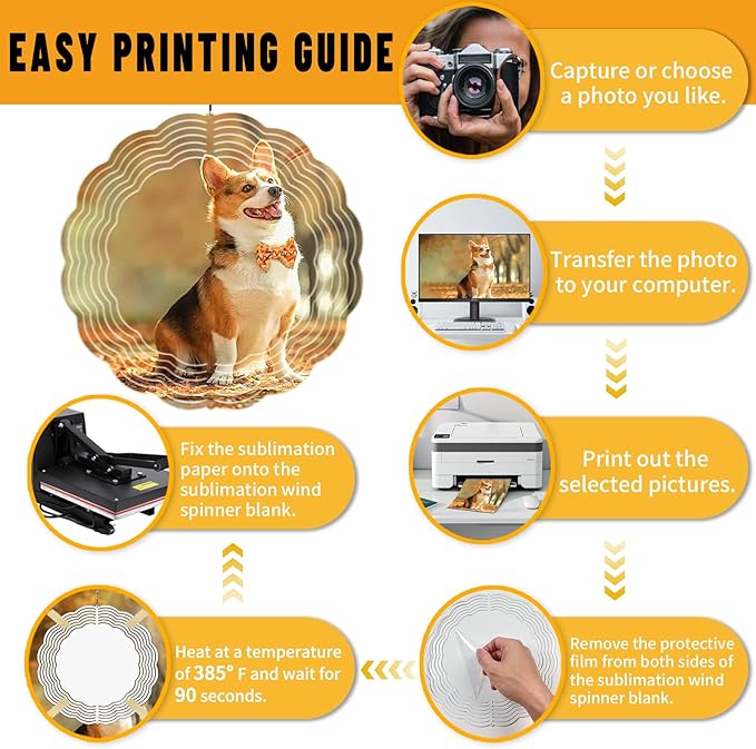 - [EASY TO USE] The sublimation wind spinner arrives blank and flat, ready for your personal touch. Choose a picture and sublimate at 385°F (196°C) for about 90 seconds with medium pressure to achieve your desired design. Be sure to remove the plastic protector before sublimating. After DIY printing, easily bend the wind spinner into a vibrant 3D shape. Adjust the temperature and time as needed