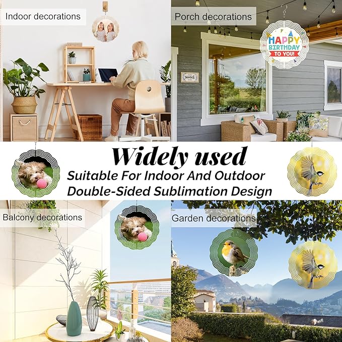 - [DOUBLE-SIDED DIY SUBLIMATION WIND SPINNER] Sublimation wind spinner blanks provide outstanding customizability, letting you add your favorite designs or photos to create a unique and eye-catching craft. These sublimation wind spinner blanks are suiting for heat transfer and UV printing, which will keep vibrant, standout colors. You can personalize both sides with either a single design or two different ones, unleashing your creativity