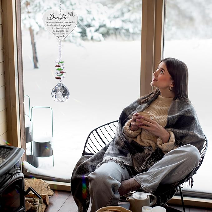 - 【Bereavement Gifts for Loss of Daughter】The delicate crystal refracts a kaleidoscope of colors in the sunlight, harmonizing beautifully with the uniquely designed stainless steel heart-shaped pendant. Laser-engraved on both sides are profoundly touching words and exquisite patterns, embodying deep longing for the daughter. Our memorial crystal suncatcher for loss of daughter will bring you the most special memories with your daughter, ensuring her companionship is never forgotten for years to come. These bereavement gifts serve as versatile and beautiful home decorations, perfect for hanging by the window, in the study, bedroom, garden, balcony, or living room.