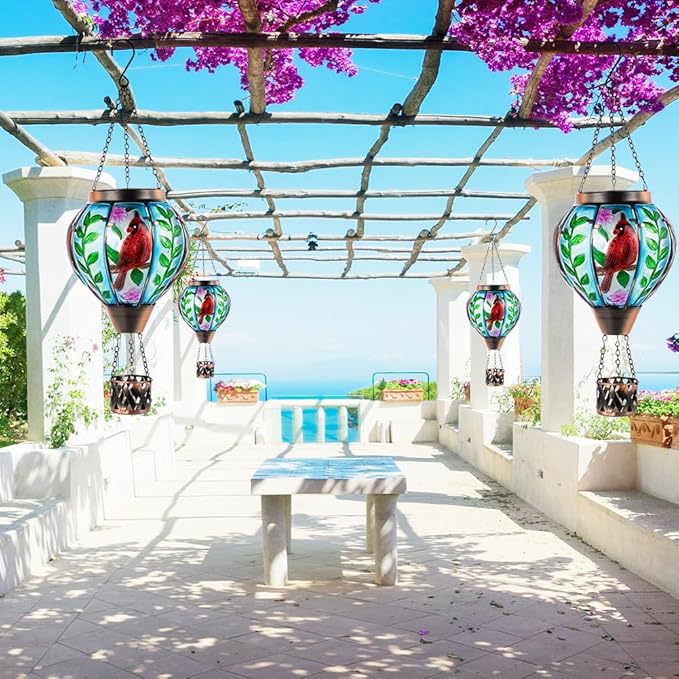 - 【Cardinal Hot Air Balloon Solar Lantern】The Starsoul solar hot air balloon lantern is composed of 8 pieces of glass: 4 pieces of cardinal and 4 pieces of green branches appear alternately. Cardinal hot air balloon lanterns are a good decoration, with bright colors and vivid patterns during the day, and the flame lights flash at night.