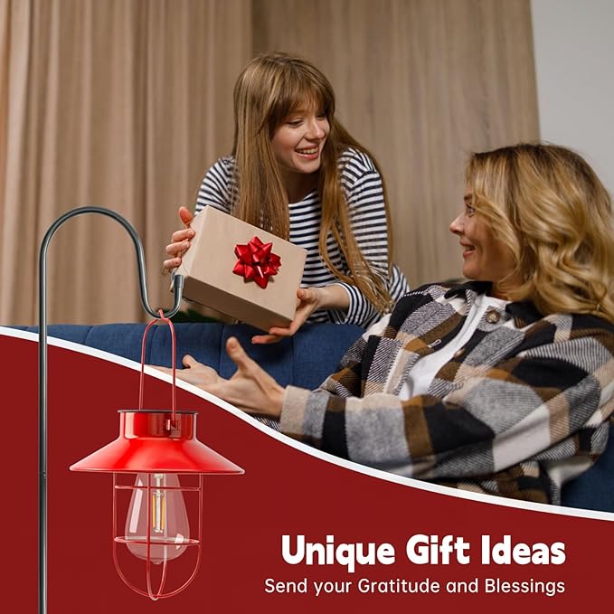 Solar Lights Lantern Lamp with Shepherd Hook, Solar Metal Lanterns, Outdoor Lights Decor,Edison Bulb Lights for Garden ,Outside Decor for Pathways,Patio, Lawn, or Landscaping(Red)
