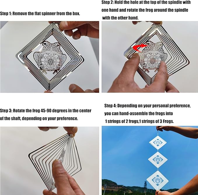 - These are 9 swivel hook and 9 Frogs shape bird scare of very shiny reflective matel wind spinners can rotate easily in the breeze.Individual Frog wind spinners are 9.25inch in length, you can connect them as long as you need.protect your garden, farm, and lawn by creating a bright flash that scares away birds.