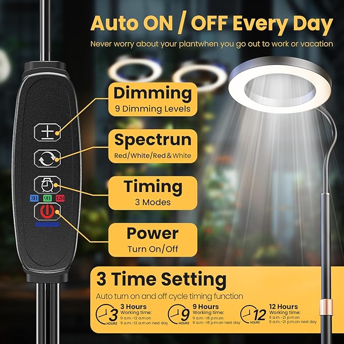 • Three cycle timing settings, this plant light will automatically turn on/off according to your desired schedule every day: 3/9/12H.
