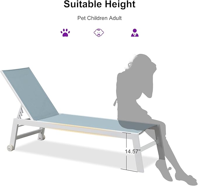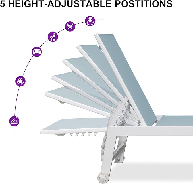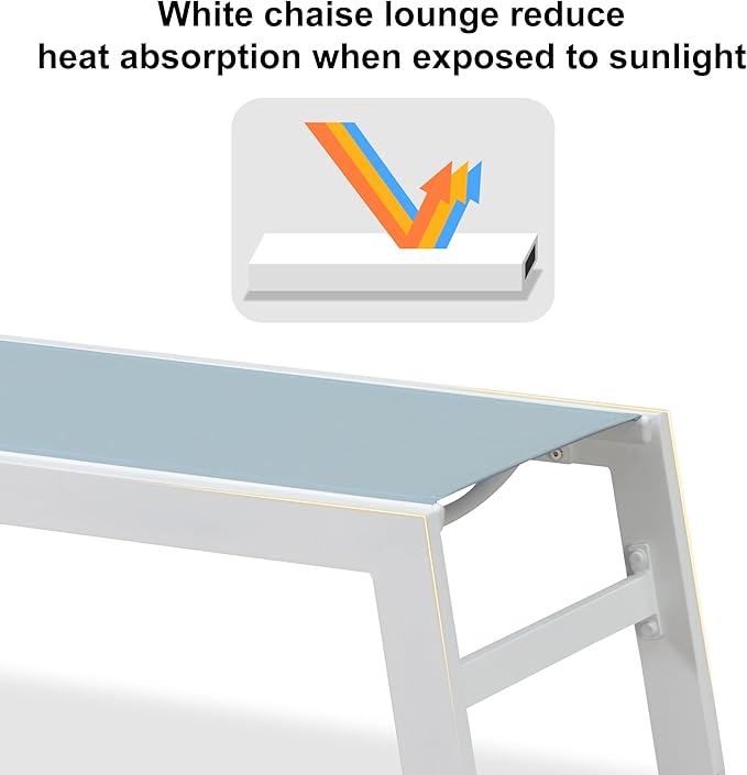 - Sturdy Frame: This chaise lounge chair is made entirely of white aluminum, which is rust-proof and protects against sun exposure; A sturdy frame provides better weight-bearing capacity and can withstand a maximum weight of 270 lbs