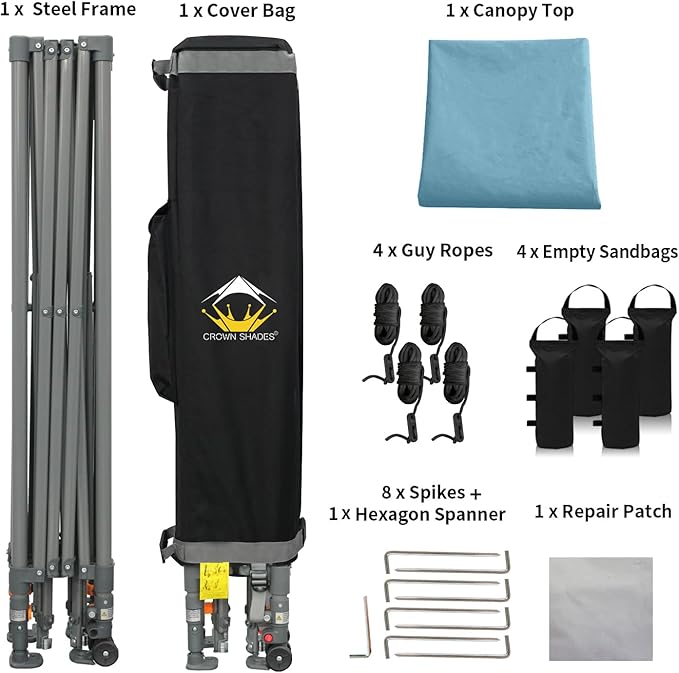 - HIGH GRADE STEEL FRAME - The durable, high-grade, corrosion-resistant steel truss frame with hardened through bolts comes pre-assembled and can be set up without any tools. Engineered to support up to 120 lbs. distributed across the frame, it ensures robust and reliable performance. The extended ceiling assembly and upgraded high peak design make it easier for rainwater to run off, preventing water pooling on the canopy. Perfect for extended outdoor use at markets, festivals, and exhibitions