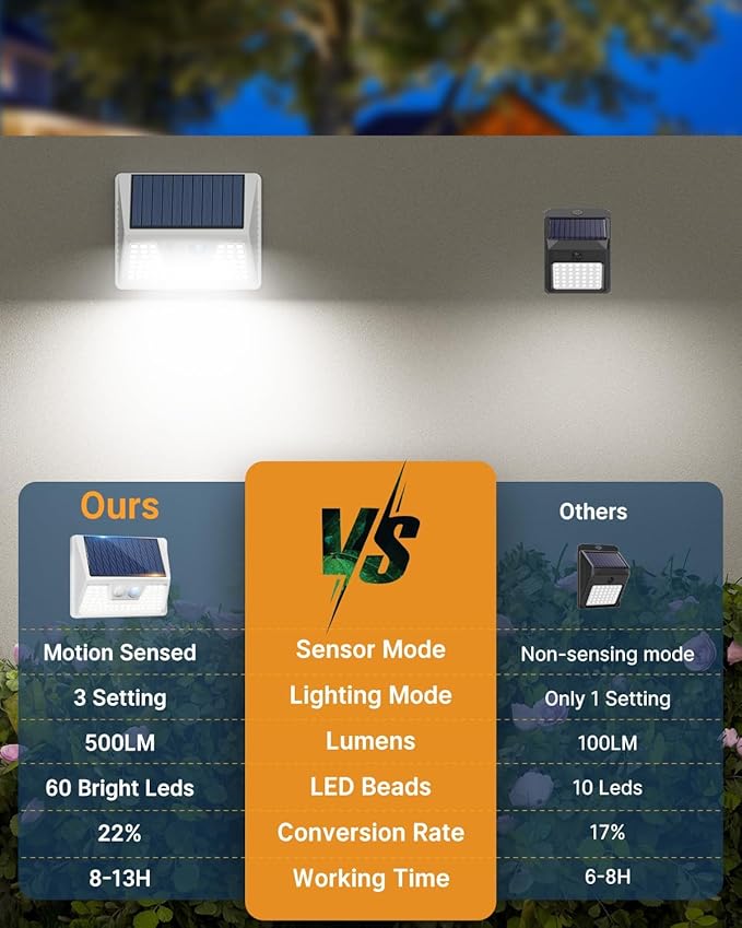 - 【Faster Charging-Longer Lighting】:This solar motion activated security light boasts a supercharged solar panel with a 20-22% conversion rate, meaning it charges up quicker during the day. That translates to longer illumination at night, keeping your outdoor space brightly lit for enhanced safety and security