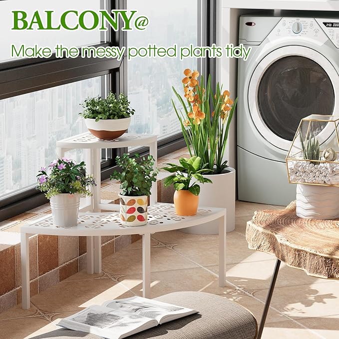 - 【2 Tiers Corner Shelf】This plant rack features 3 tiers to showcase your beautiful flowers, succulent collection, yard decorations, garden tools, and so on. 90° design is saving space and ideal for placing it in the corner.3 tiered plant stand provides large storage space, allowing around 9 different size flower pots be displayed.