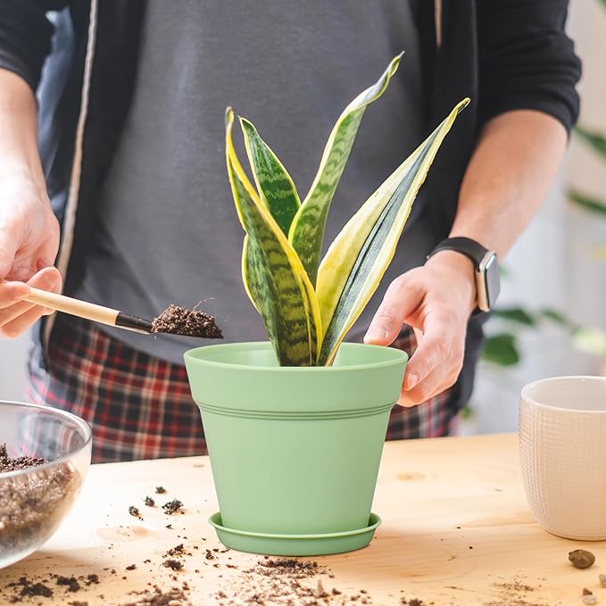 6 inch Plastic Nursery Pots, 16 Pack Plant Pots for Small Indoor Outdoor Plants, Flower Pots with Drainage Holes and Saucers, Decorative Seeding Starter Planters for Houseplants, Green
