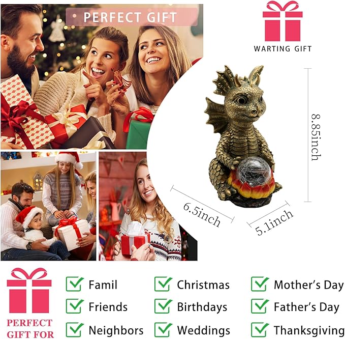 - 【Unique Dragon Design】This Cute Gold Dragon outdoor decor With 7-Color Changing Solar Crackle Globe Lights, 7-color light cycle change,adds a touch of magic to your outdoor space. Dragon statue 6.5"x 5.1"x8.85" size ensures it becomes a focal point in your garden, pathway, or even on a wide windowsill, leaving a lasting impression.