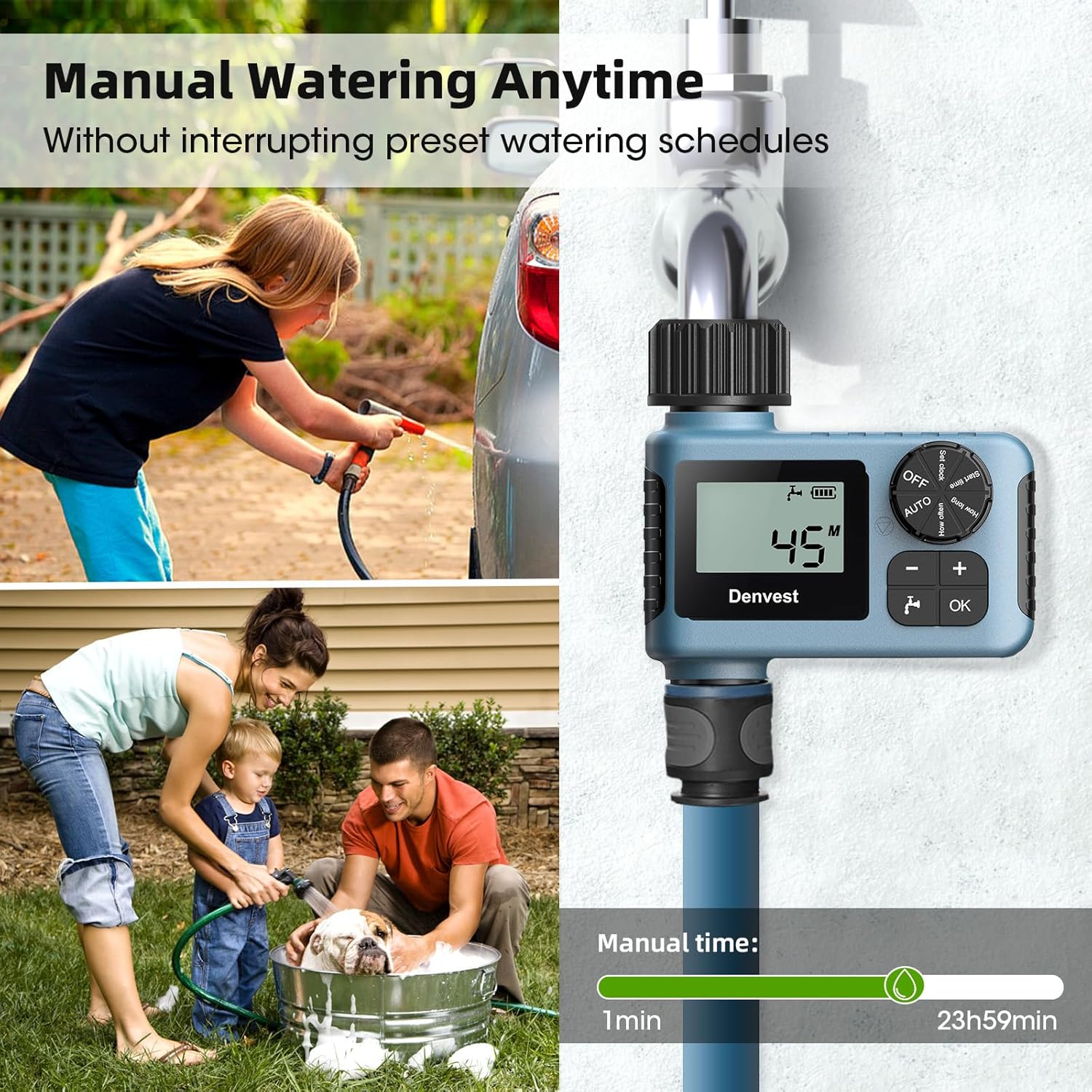 - 【3 Watering Modes】To cater to varied watering needs, this outdoor sprinkler timer offers three modes: Auto, which runs on your pre-set schedule; Manual, where you can use the faucet to do other things from 1min to 23hours59 mins without disrupting your watering plans; and Rain Delay, pausing your schedule for 1-7 days during rainy days, then resuming automatically, conserving both water and costs.