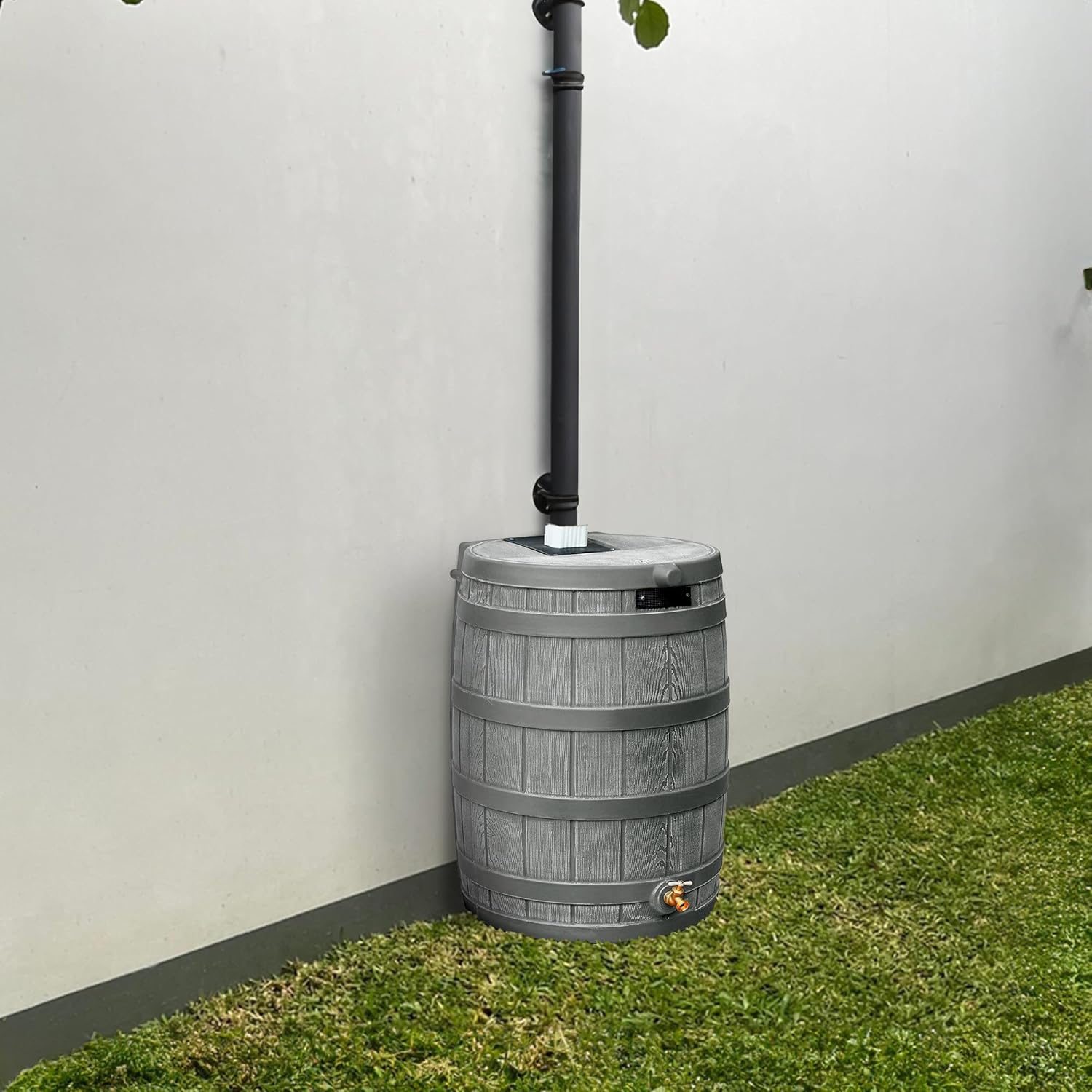 • Sleek Rain Barrel: Harness the power of nature with this sleek gray faux wood rain barrel, designed to capture and conserve rainwater; Complete with a brass spigot, effortlessly link up your hose or utilize it as a convenient overflow outlet
