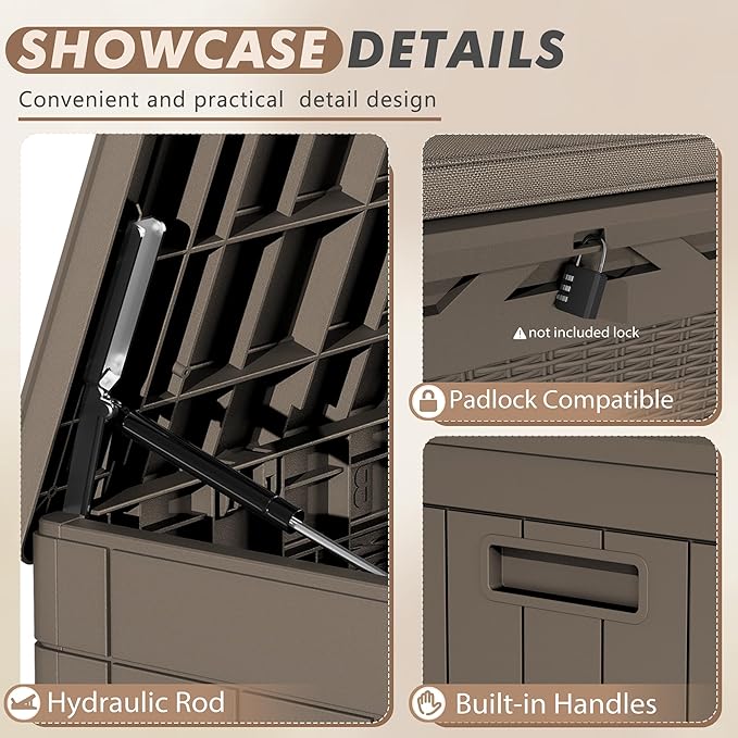 - Extra Bench Cushion: Patio storage box also includes a comfortable cushion for use as a two-person bench. Additionally, the handles on both sides allow for easy mobility, and the hydraulic gas strut design prevents pinching. It is further enhanced with a lockable lid to ensure safety