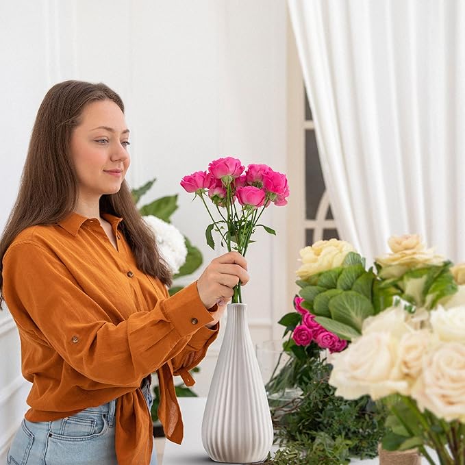 - Pack of 3 Vases Dimensions: Each small white vase measuring 12"x 8.5" are perfect for showcasing your favorite blooms, as a centerpiece vases for table, or as standalone pack of 3. They each have a slightly different look (Horizontal Stripes, Verticle Stripes and Smooth Finish).