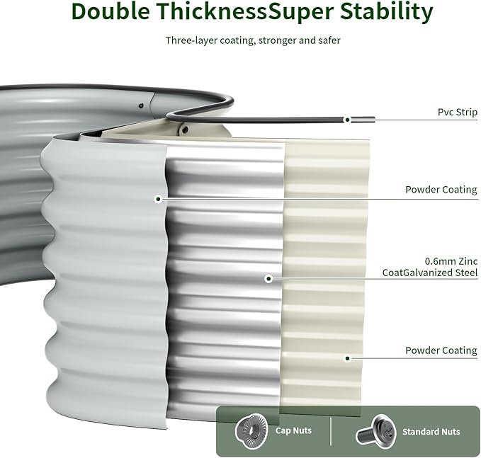 - 【Easy To Assemble】Colored coated steel garden bed with instruction manual, installation tool gloves, screwdriver, and galvanized screw kit; Our bed features an oval design with no sharp corners and comes with rubber trim to cover the edges and prevent injury.