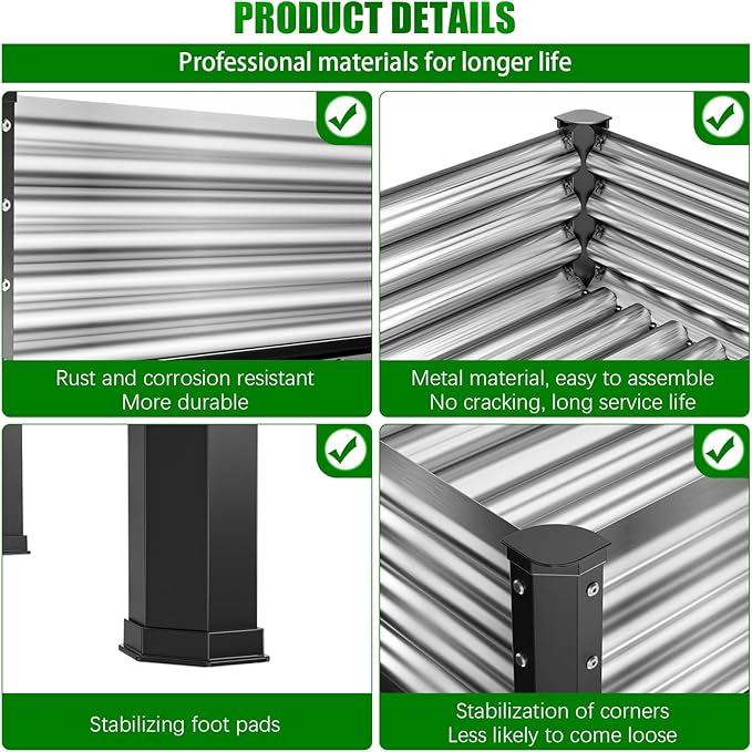 - 【High Quality Raised Garden Bed 】-Raised garden bed is made of stable thickened galvanized metal steel ,it is durable, reusableenvironmental friendly and easy to clean,withstand harsh weather conditions ,which makes this product more stable and solid than wood or plastic beds and won't crack in cold temperatures. can be expose to sun, rain, snow for a long time.