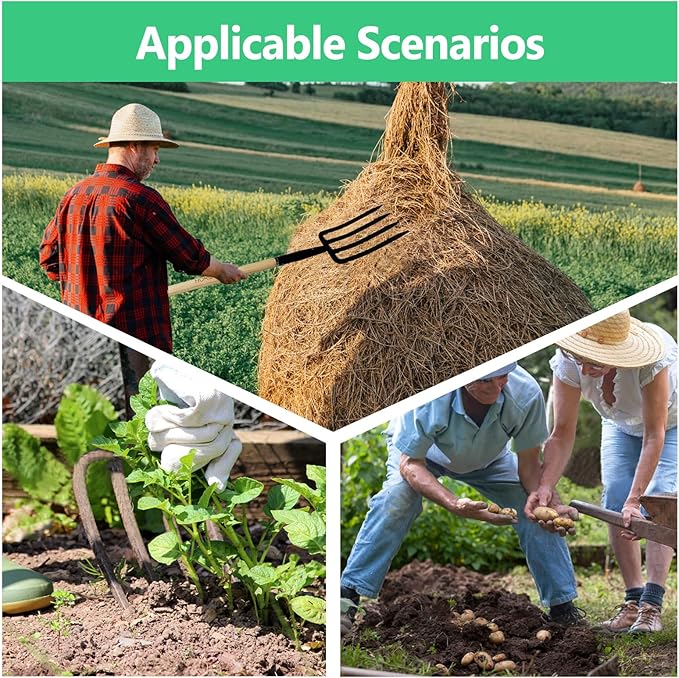• Multi-Use:The sharp V-shaped tines of the digging fork can quickly penetrate hard soil,Pitchforks For Gardening Suitable For Loosening The Soil, Moving Mulch, Leaves, Straw, Hay Or Garden Debris, Turning Over Compost, Soil And Digging Potatoes Garlic.