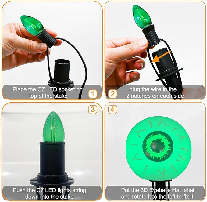 - Safe and LED Energy Saving: LED Halloween decorations eyeball pathway lights with 4 C7 led multicolor bulbs, E12/C7 candelabra base, 0.6W per bulb, halloween pathway lights outdoor UL Listed for indoor and outdoor use. If a light bulb that goes out does not affect other lighting bulb. Tips: A spare 5A/120V fuse stored in male plug. The multicolored eyeballs landscape pathway stakes lights add a chilling charm to your garden after dark.